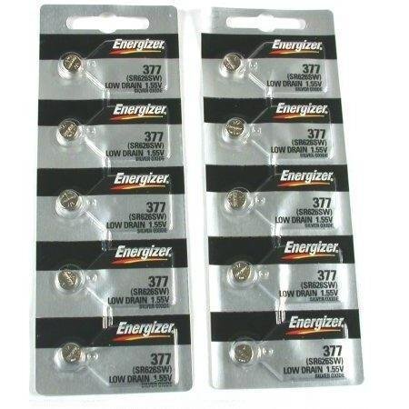 Ten 377/376/SR626SW Energizer Watch Batteries. This is a new set of 10 type 377/376 (SR626SW) Energizer batteries. There are 5 batteries in a package. ENERGIZER - trusted power for proven performance and reliability. Brand new & guaranteed factory fresh. The shelf life on Energizer batteries is 5 to 10 years. These batteries are commonly required for Swatch, Fossil, Timex and Casio. Energizer's reported failure rate is far less than 1/1000 of 1%. This devotion to consistent quality has led it to control over 70% of market share in Switzerland, one of the world's leading watch producing countries. Energizer is respected world wide for its uncompromising quality and consistent performance. Energizer's technological leadership produces a variety of miniature batteries which are trusted for use by the best names in watch, computer, keyless entry, consumer electronics and hearing aid industries.