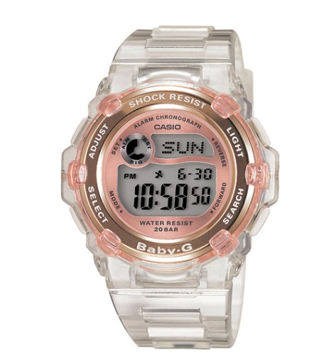 It is more compact than the regular Baby-G, which is great. Since rose gold is all the rage this year, the rose gold face on this watch makes it fashionable. Love, love, love the clear strap.