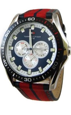 The Tommy Hilfiger brand consistently combines fresh American style features with unique details. With this Tommy Hilfiger Men's Multi-Function Watch, a time-honored classic is given a modern look. This watch, which is powered by Japanese-quartz movement, is waterproof up to 165 feet. The band, which is made of leather and striped canvas, accompanies the buckle clasp, and the 47-millimeter case is made of stainless steel. The dramatic navy-blue dial face offsets the easy-to-read indexes, and for additional time-telling convenience three sub-dials indicate the day, date, and month. This watch is backed by a 10-year limited manufacturer's warranty.