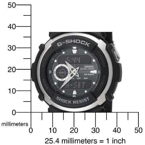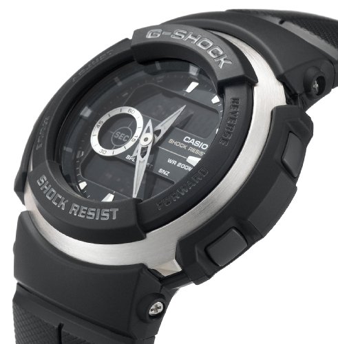 This analog/digital Casio G-Shock Street Rider men's digital sport watch (model G300-3AV) is a great companion for jogging and biking through urban terrain. Large and in charge 43mm case, this shock resistant watch will withstand virtually any punishment you can mete out. It will also stand up to the rigors of recreational scuba diving, with water resistance to 200 meters (660 feet). It includes a 1/100-second stopwatch with a 60-minute measuring capacity and elapsed time, split time, and 1st/2nd place time modes as well as a 24-hour countdown timer.