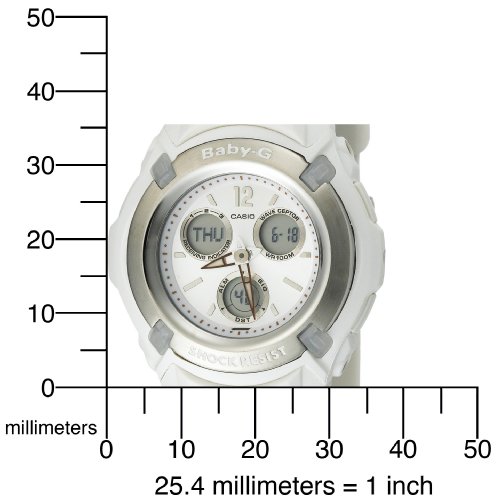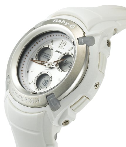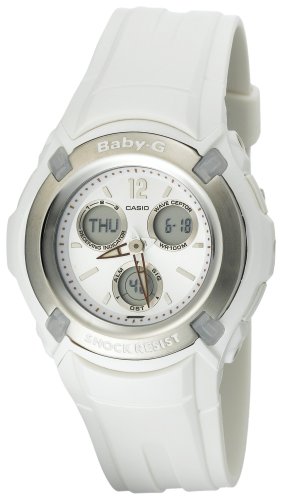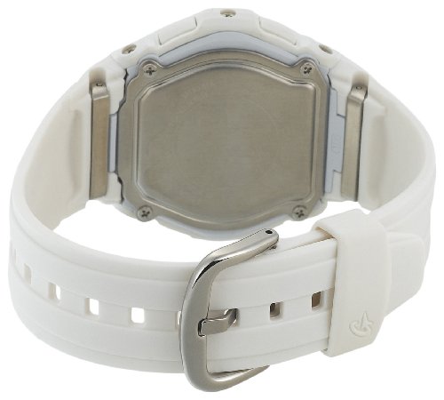 Tough and rugged enough for any workout regimen or outdoors training, this shock-resistant Casio Baby-G women's sport analog/digital watch (model BG1500A-7BV) is also very precise thanks to its atomic timekeeping features. It features a stylish white resin case and silver top ring, which frames a white dial face with three light silver digital subdials (which display day, date, and the 1/100-second stopwatch). Other timing features include world time from 48 cities, 12/24-hour display, autocalendar (to the year 2099), and hourly time signal. This watch is water resistant to 100 meters (330 feet), suitable for recreational snorkeling. It also offers a tapered white resin strap, scratch-resistant mineral crystal, and AfterGlow LED electro-luminescent backlight.