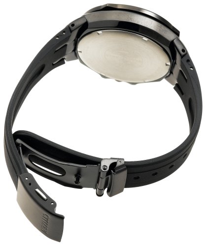The large round black ion-plated stainless steel case measures 44mm (1.73 inches) wide and 14mm (0.55 inches) deep, and it's topped by a bi-directional rotating slide rule. The black dial background features large white hands with luminous tips as well as luminous square dial markers. It's completed by a comfortable black polyurethane strap. Other features include water resistance to 330 feet (100 meters) and a scratch-resistant, non-reflective mineral crystal.