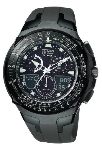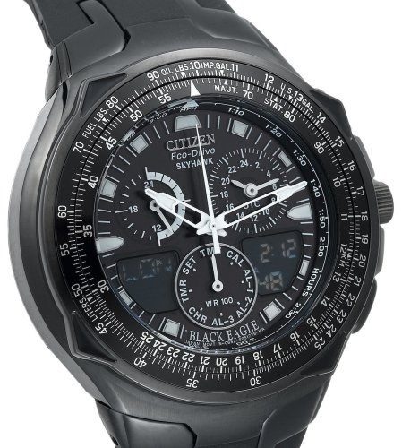Sporting a hardened, special ops look, the Citizen Black Eagle Skyhawk stainless steel men's flight watch offers advanced timing functions and the latest technology. It's powered by Citizen's unique Eco-Drive, which absorbs sunlight and any artificial light through the crystal and dial to recharge the watch continuously. The fast-forward timekeeping features include time and calendar in twenty-two time zones, thirty cities, three world time alarms, a 99-minute countdown timer, one-touch interchangeable analog/digital time, and 1/100-second chronograph that measures up to 24 hours.