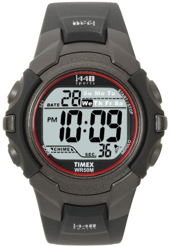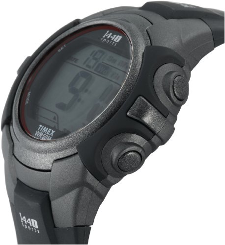 This Timex men's 1440 Sport digital watch integrates technological innovations with contemporary details. Accompanying the tenacious buckle clasp is the durable resin band, which is attractively detailed with two alternating shades of gray. The stainless steel case is subtly enhanced by a red-tone rim, and the matte-gray dial face is prominently embellished with easy-to-read numerals. For additional time-keeping efficiency, the watch also includes a handy day-date-and-month calendar, a 24-hour chronograph, and a 24-hour countdown timer. Other features include a daily alarm, an Indiglo night light, and a dual time-zone tracker. Powered by digital-quartz movement, this forward-thinking and iconic timepiece is a must-have for fashion-savvy sports enthusiasts. This watch, which is water resistant up to 165 feet, is backed by a 1-year limited manufacturer's warranty.