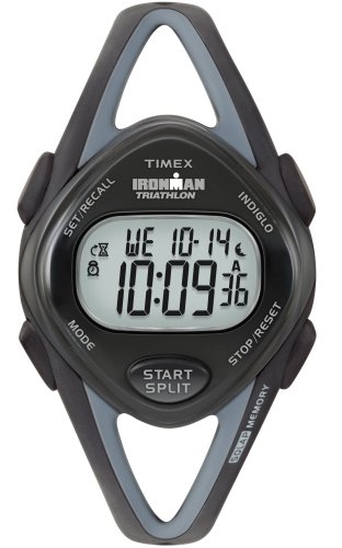 The Timex Midsize/Unisex Ironman Sleek Digital Watch is designed to survive the tough workouts of a training triathlete. The watch is constructed with a lightweight resin case, a diamond shaped black resin bezel, and a black resin wristband with a secure buckle clasp. A durable mineral window shields the digital-gray dial face, which displays the time as well as the day, date, and month. Four black buttons decorate the bezel--mode, stop/reset, Indiglo, and set/recall--while a prominent black start/split button rests below the six o'clock position and tracks up to 30 laps. This athletic timepiece is powered by digital-quartz movement and is water resistant to 330 feet.