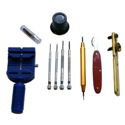 bands. The kit includes 4 screwdrivers, sizes 1.20mm, 1.40mm, 1.60mm and 1 philips, plus extra blades, watch case opener, spring bar remover, screw type link remover with extra tips, knife with plastic handle, eye loupe and finally a compact case to hold all the